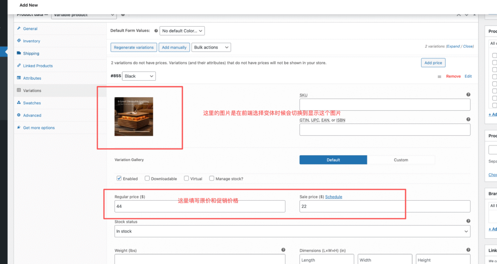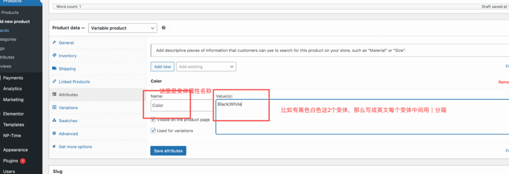 Blocksy主题多变体产品上架教程NopassWordpress教程 1、首选在后台创建产品 2、创建可变产品 3、创建属性 4、生成变体属性,点击生成变体 5、给每个变体添加图片和价格 6、添加好信息后,设置变体按钮属性图片显示 7、点击更新保存 8、前端显示 上一页 文章 点击产品新开窗口